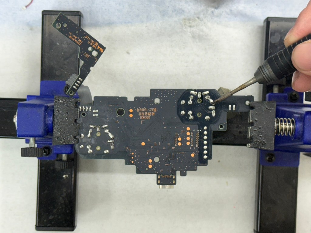 16.再來用 夾具 夾住 主板,然後用電烙鐵 搭配 吸錫帶 或者 吸錫器 將搖桿解焊