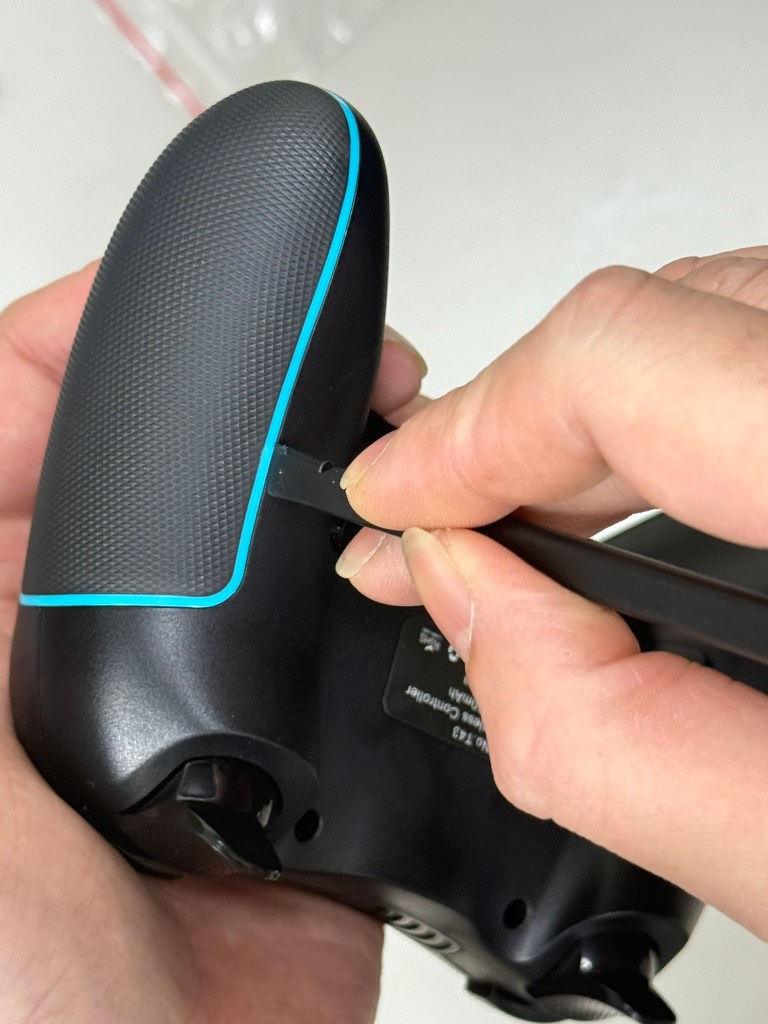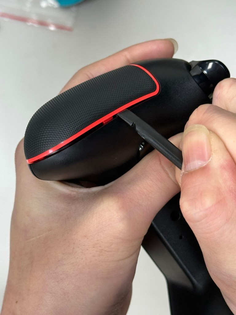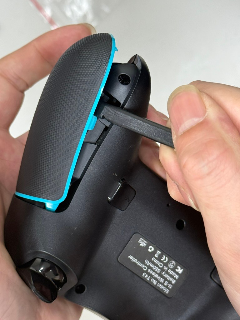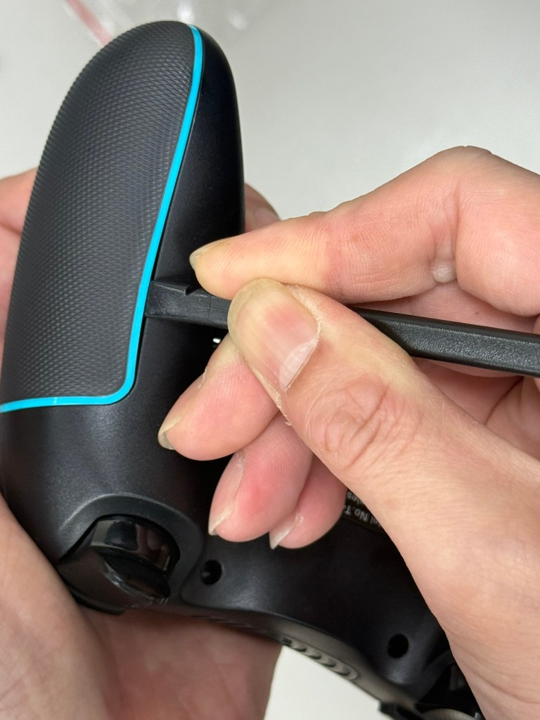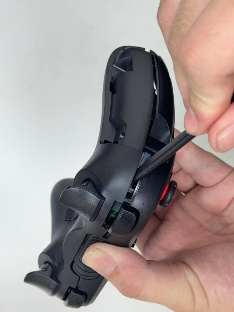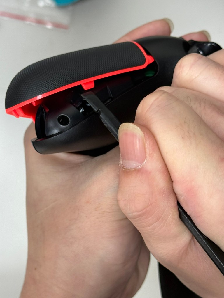 2.用翹棒(用平頭那一面)將先插入右握把接縫處,然後往下滑開之後 在卡榫旁(第二張圖)往下一點會有一個洞讓翹棒進去之後 翹起來就可以打開了。請注意在操作時 不要讓尖頭對準自己