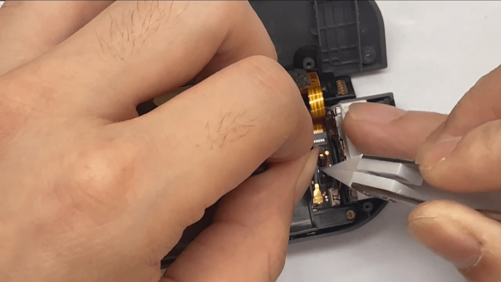 7.安裝回去就是先對好電池排線跟電池座的接點,對好之後用 翹棒或者 鑷子(這邊看你習慣,看自己用哪個順手,再壓下去就好囉,然後再把電池放入電池槽內就可以了。