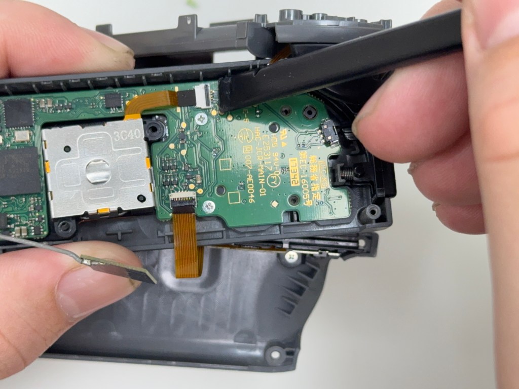 9.用翹棒或鑷子(小心地把排線座的蓋子給打開)要取出搖桿的排線