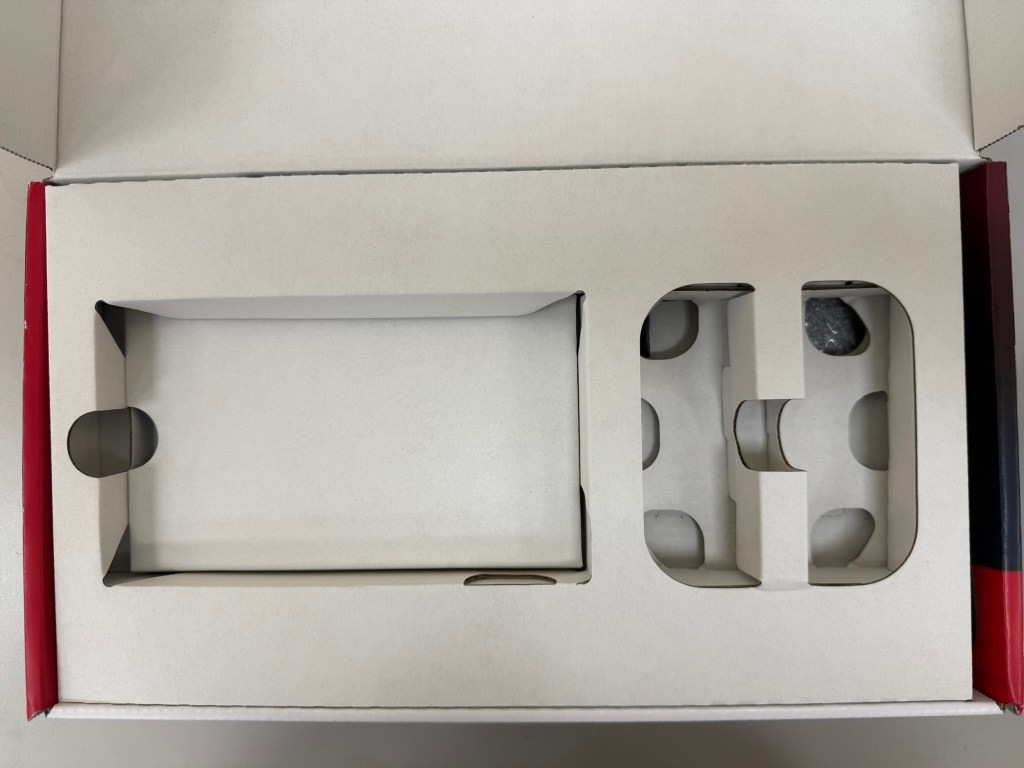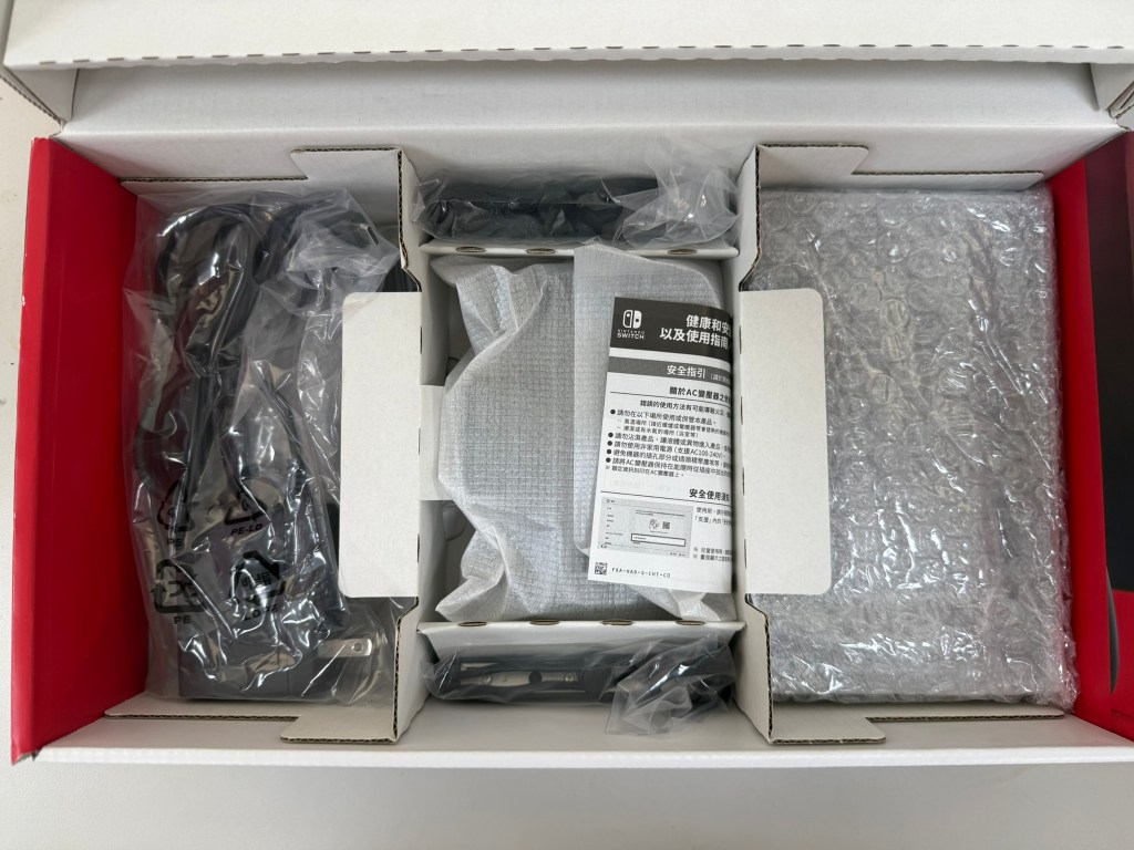 Switch OLED 的包裝是 直立的,也比原本 Switch 電力加強版的包裝節省空間,收納的位置很清楚明確,這樣也減少了包裝成本