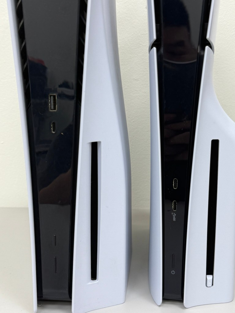 PS5 Slim 主機的 開機鍵 沒有改變 但光碟機按鈕 就改在了 光碟機本身(主要是光碟機是可拆式的 所以才這樣做),然後 前端的USB孔沒有了 改成了 TypeC孔 2個