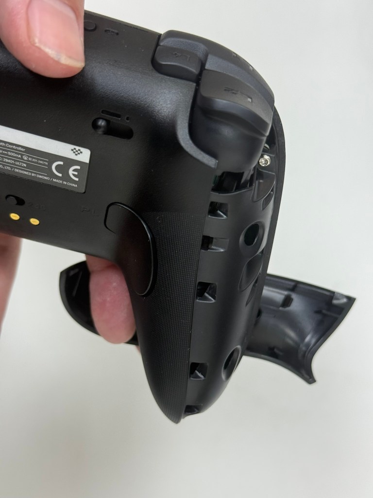 3.再用翹棒 從握把底部沿著縫隙開殼,打開的時候 手把的前緣處(充電接口那邊)會很緊 緊到讓你以為有 螺絲再裡面 沒有卸掉,但那只是卡榫吃的很緊 所以還是可以打開的