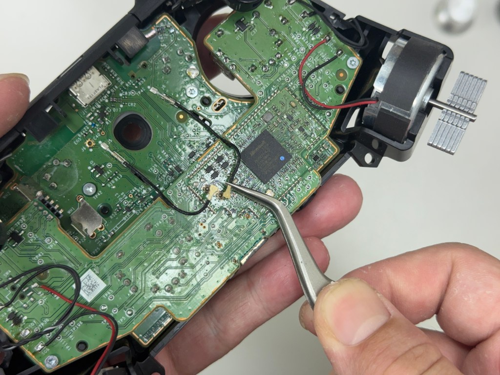 電烙鐵溫度 350度,然後 用鑷子夾住線,然後電烙鐵放下去 有看到錫有化開 就可以把馬達的電線移開了