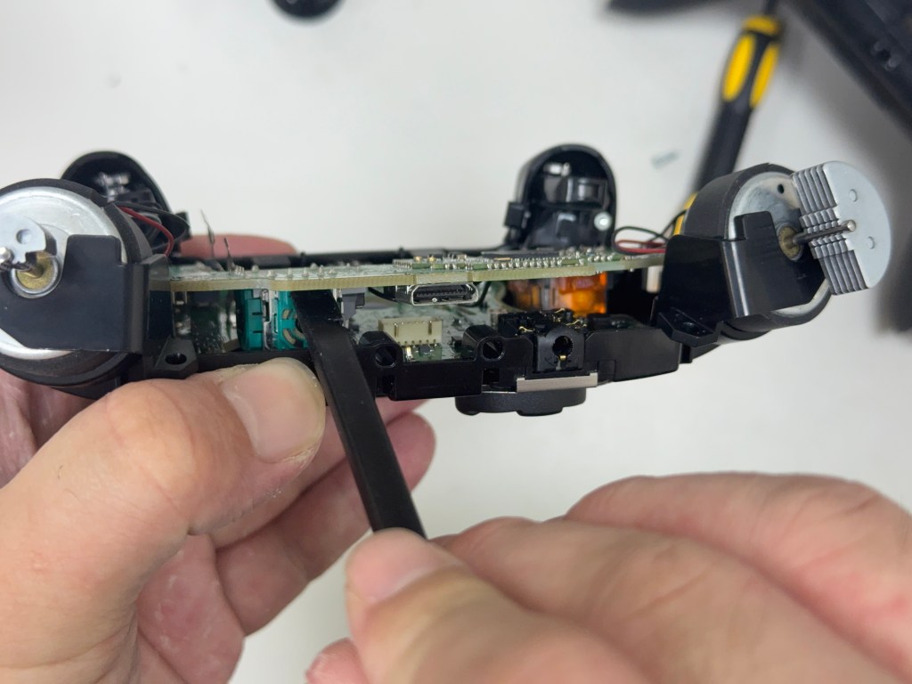 7.螺絲取下之後,用電烙鐵 將 馬達的電線都解焊掉,不然 上半部的主板這樣是沒有辦法取下來的。