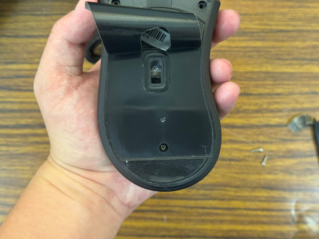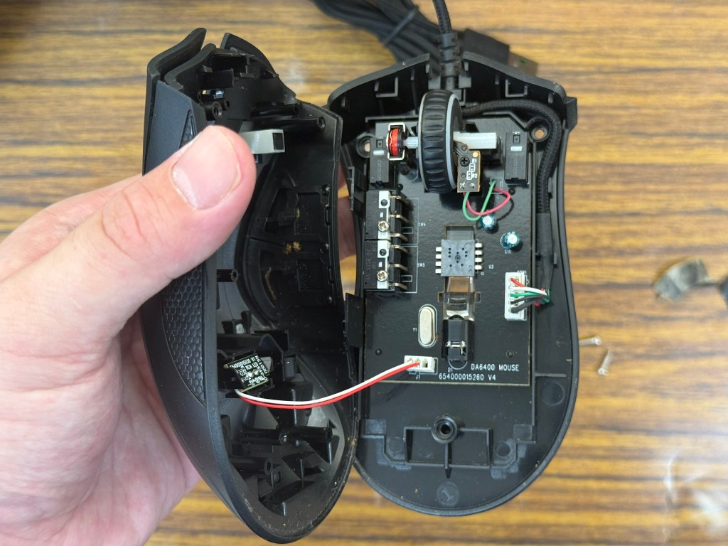 3.再用翹棒 從握把底部沿著縫隙開殼,分離滑鼠的 上下層